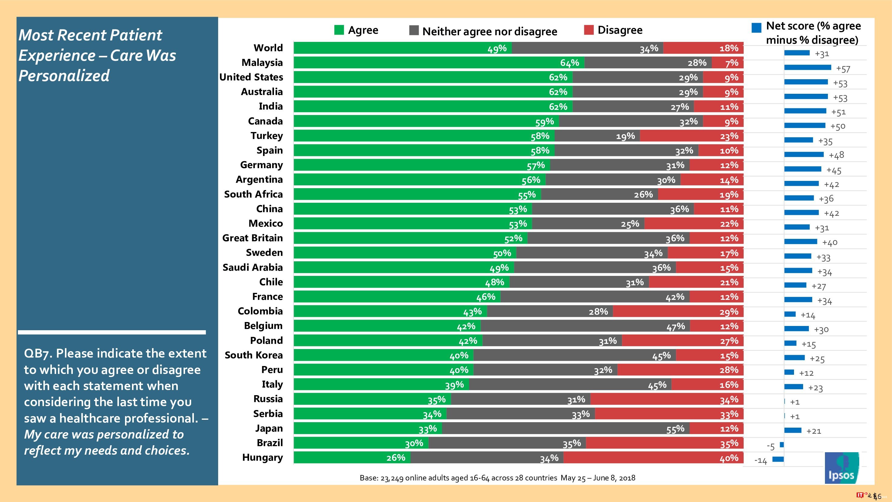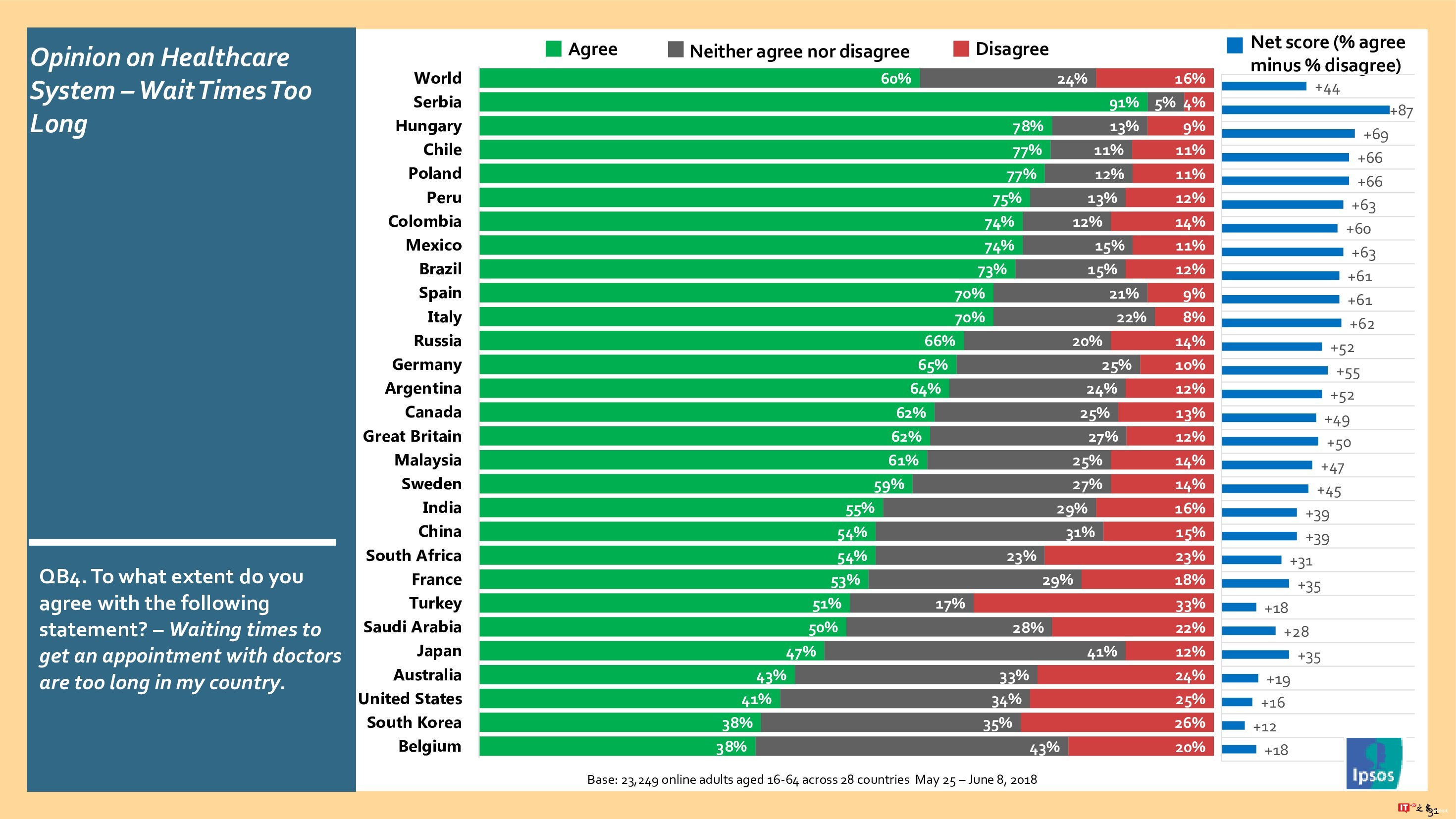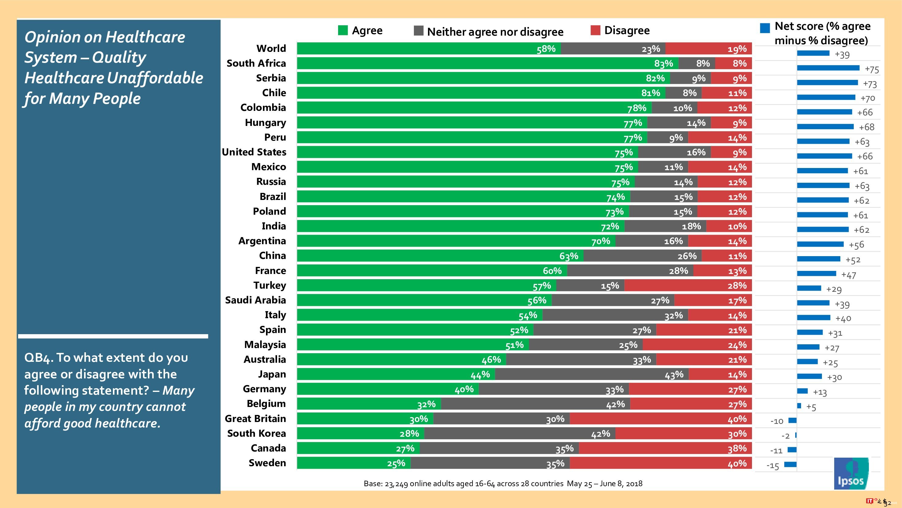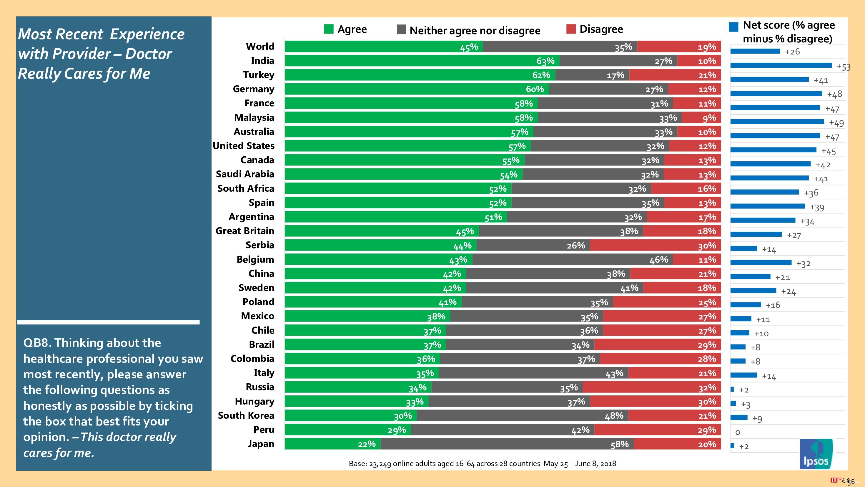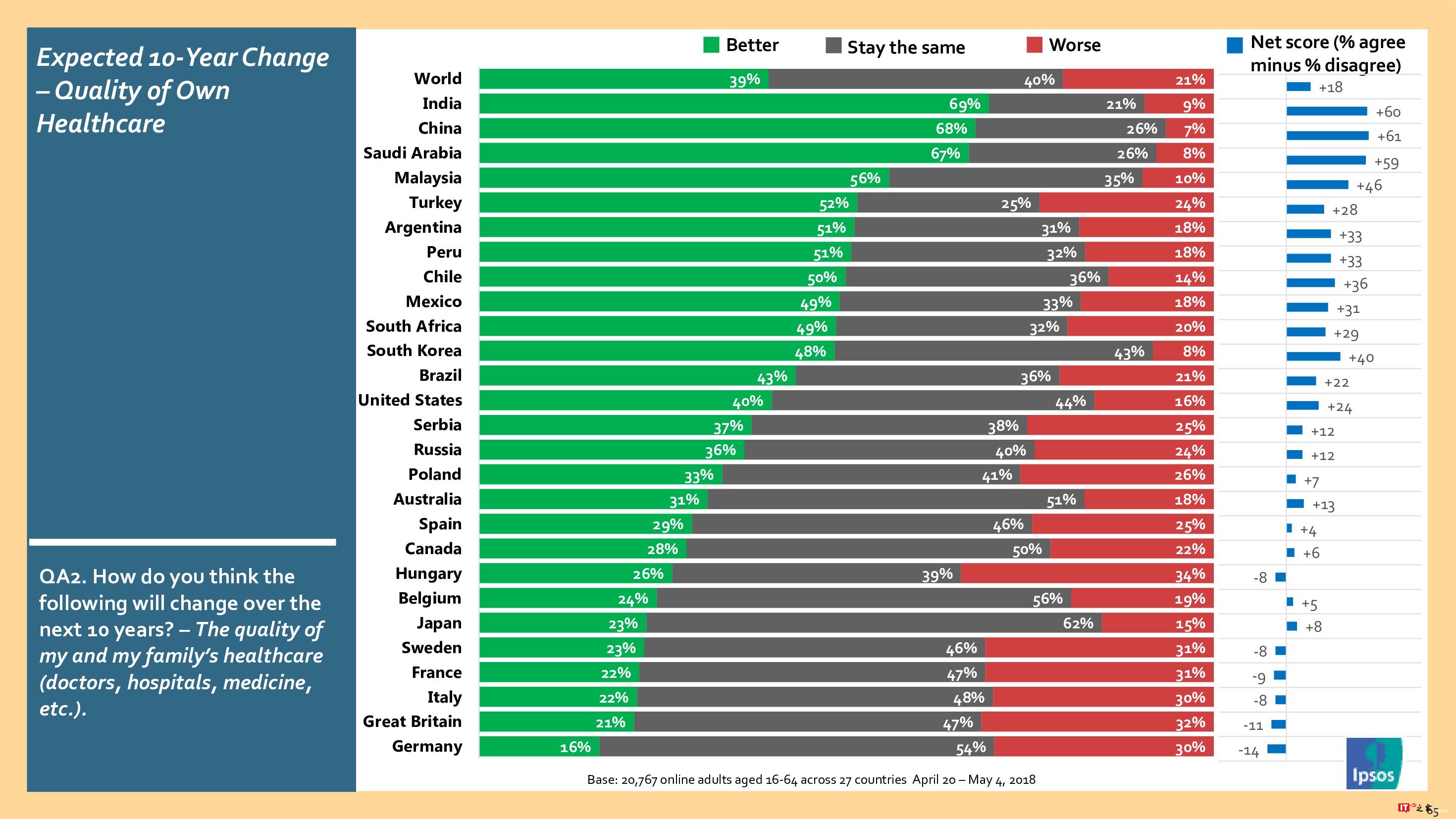 根据益普索对全球23,000多名成年人的调查,消费者对其医疗保健质量的评估差异很大。在全球范围内,45%的受访者认为他们在本国获得的医疗保健质量是好的,33%认为既不好也不差,23%认为很差。在接受调查的国家中,英国(73%)、马来西亚(72%)和澳大利亚(71%)人对本国医疗保健的评价最好。相反,巴西(39%)、波兰(31%)和俄罗斯(29%)的评价最差。