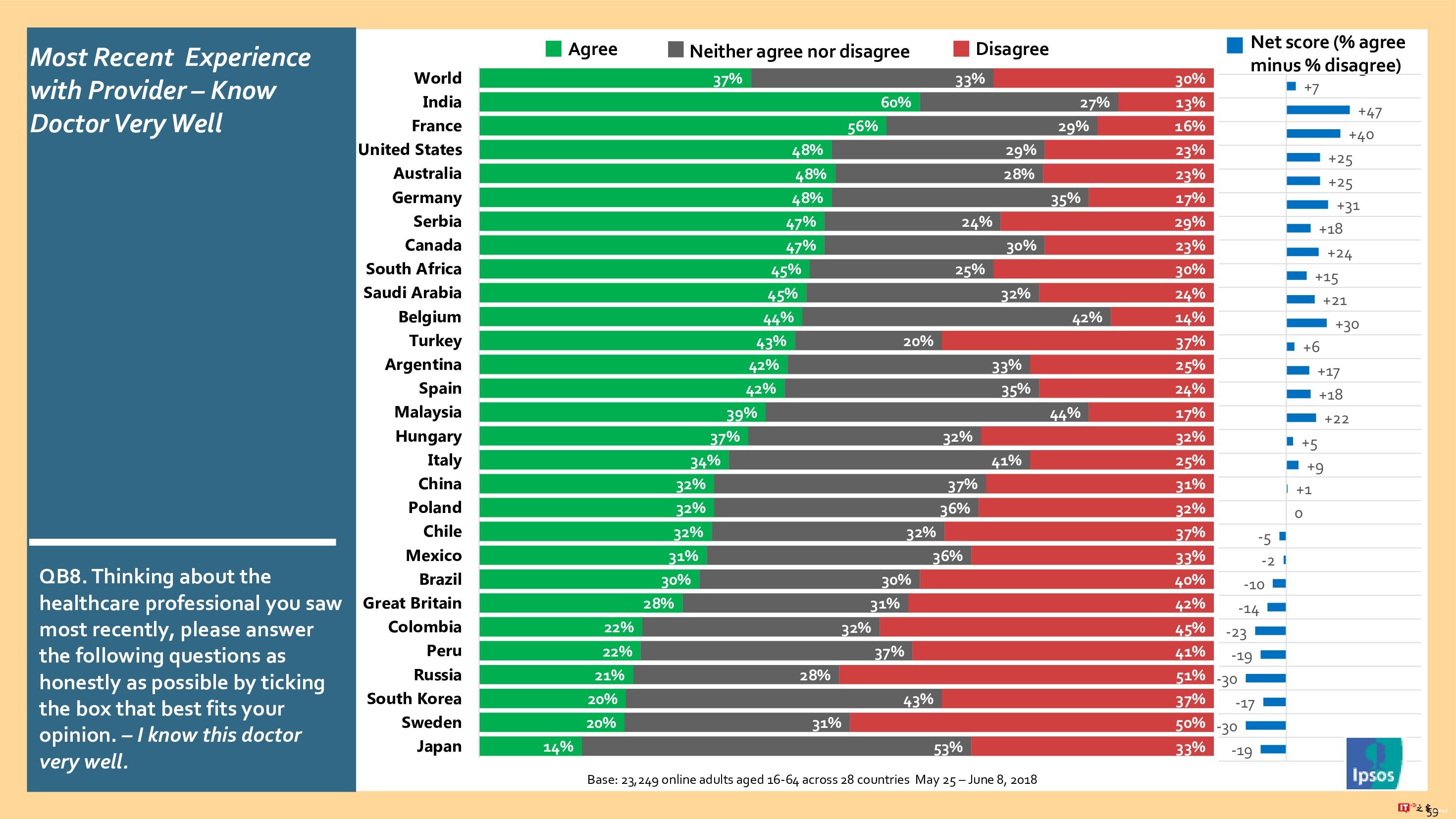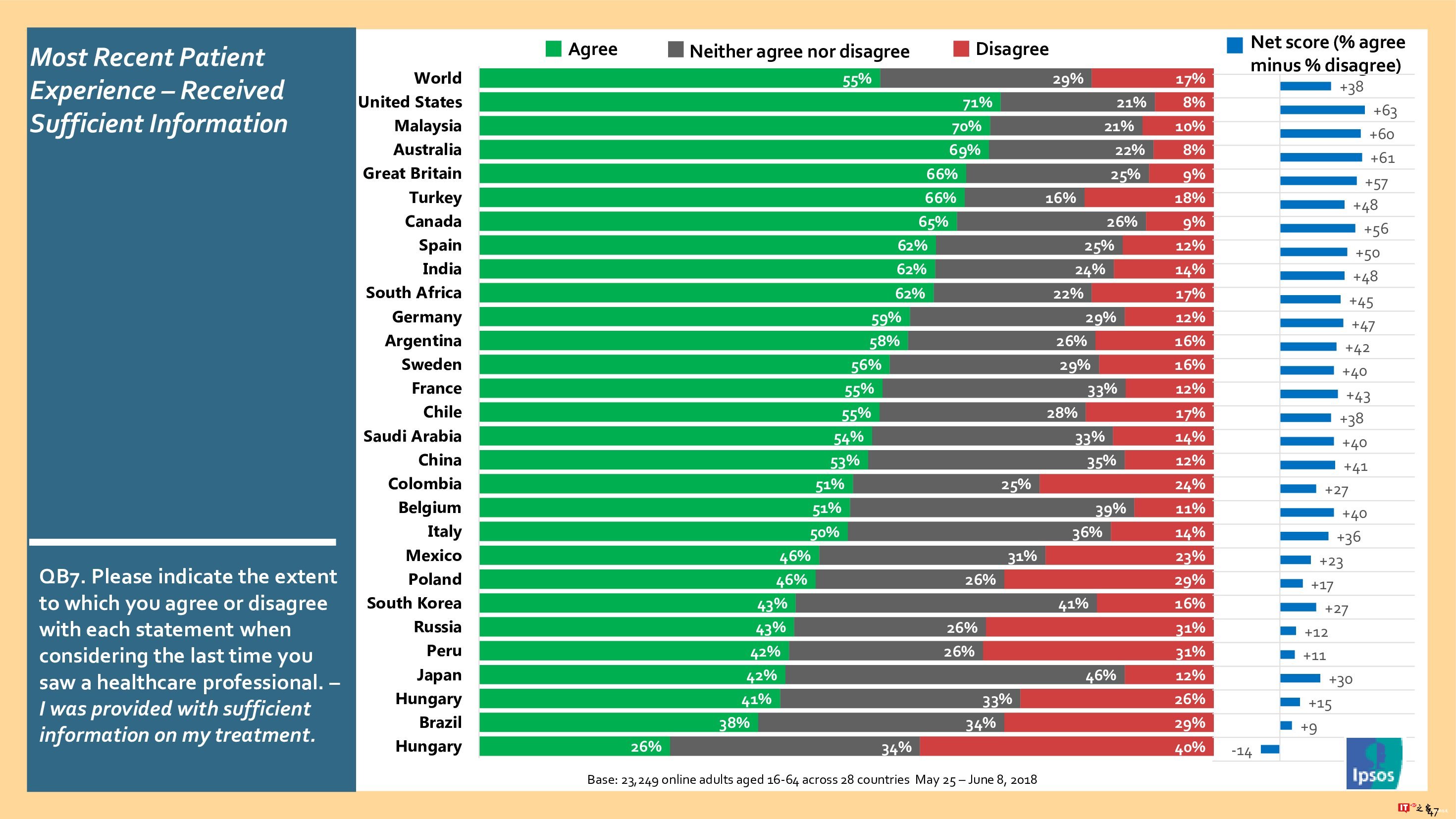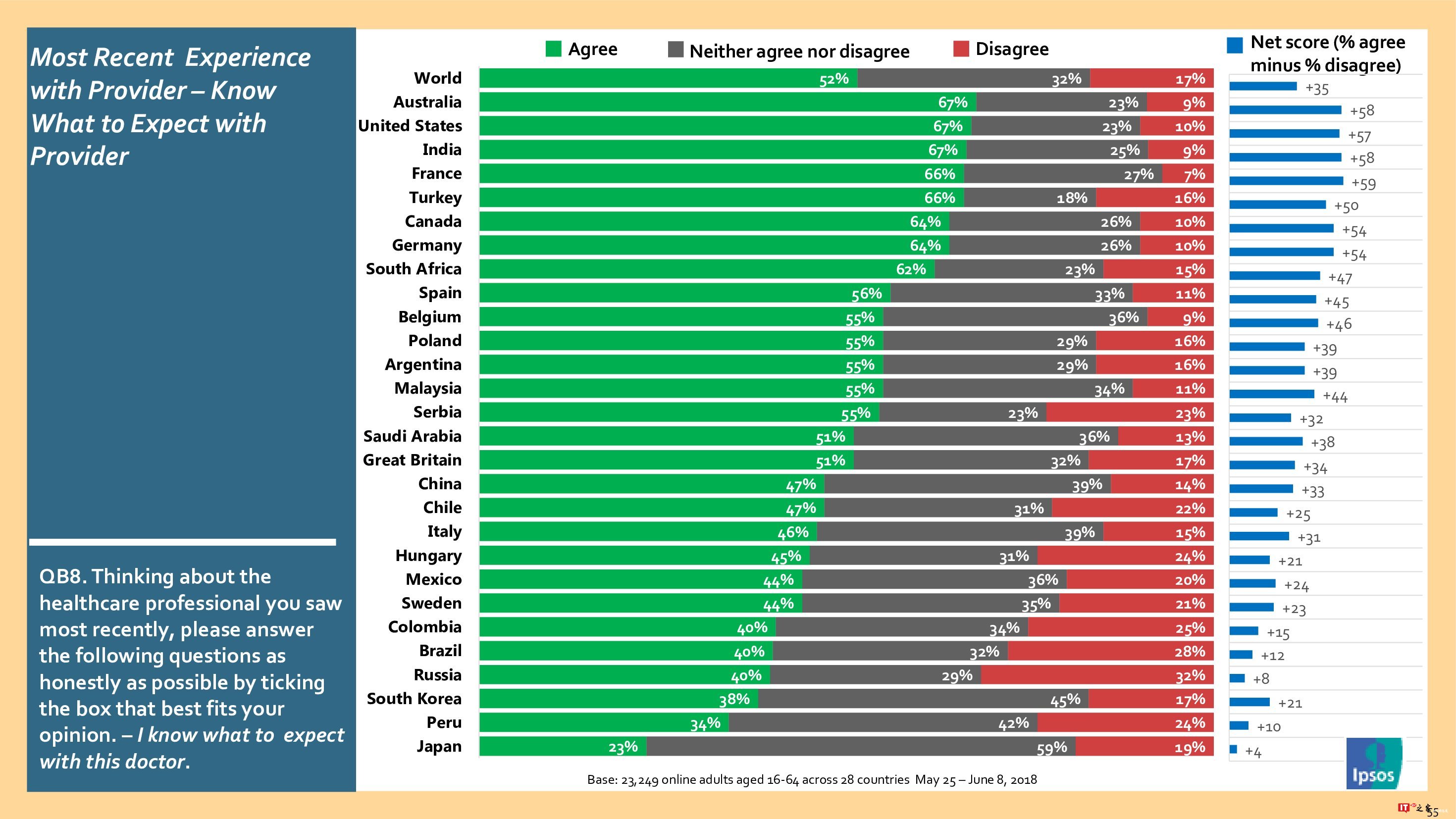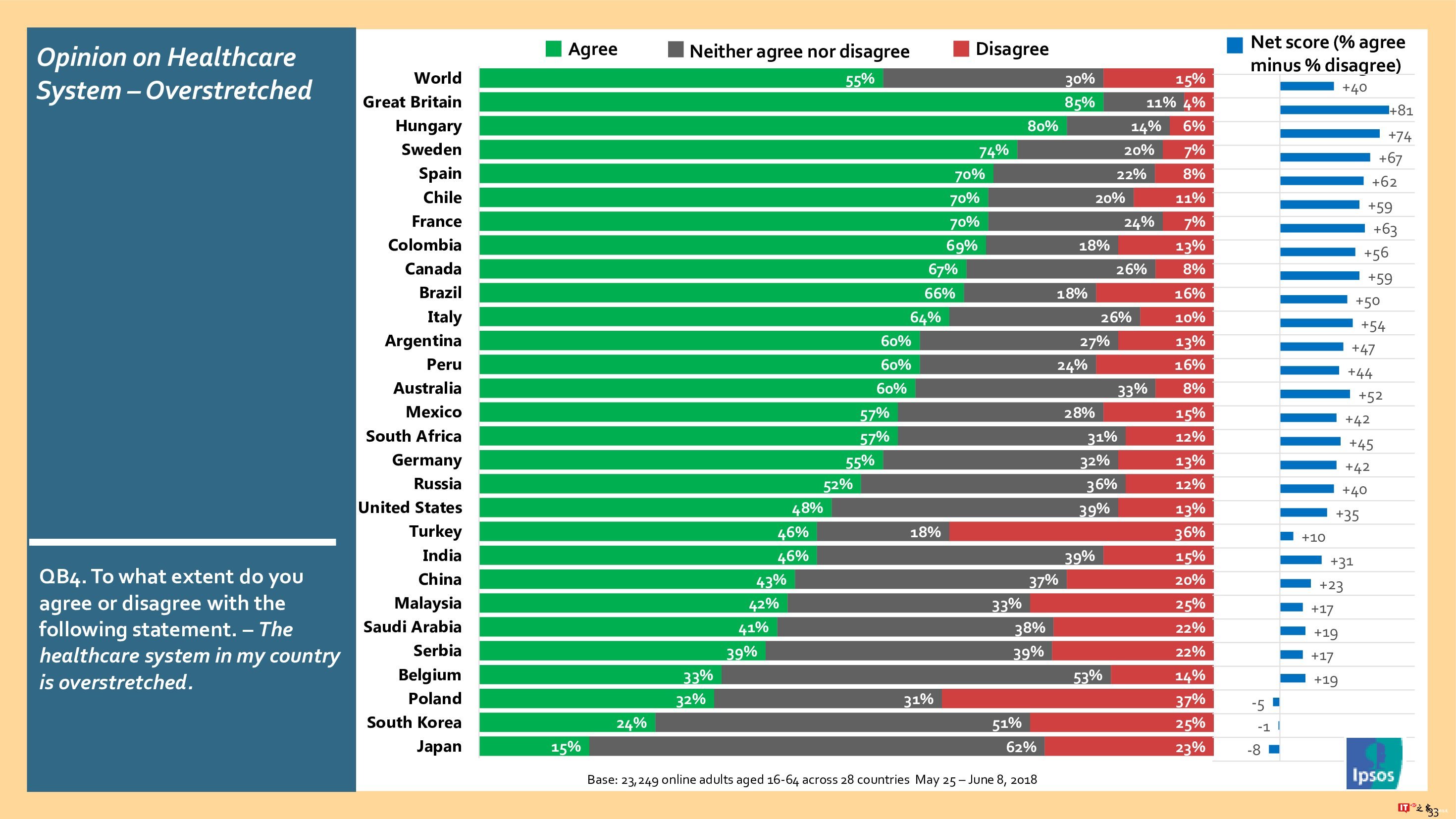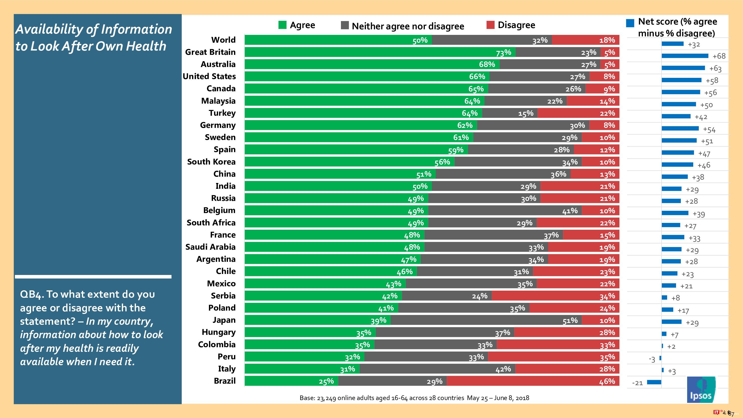 根据益普索对全球23,000多名成年人的调查,消费者对其医疗保健质量的评估差异很大。在全球范围内,45%的受访者认为他们在本国获得的医疗保健质量是好的,33%认为既不好也不差,23%认为很差。在接受调查的国家中,英国(73%)、马来西亚(72%)和澳大利亚(71%)人对本国医疗保健的评价最好。相反,巴西(39%)、波兰(31%)和俄罗斯(29%)的评价最差。