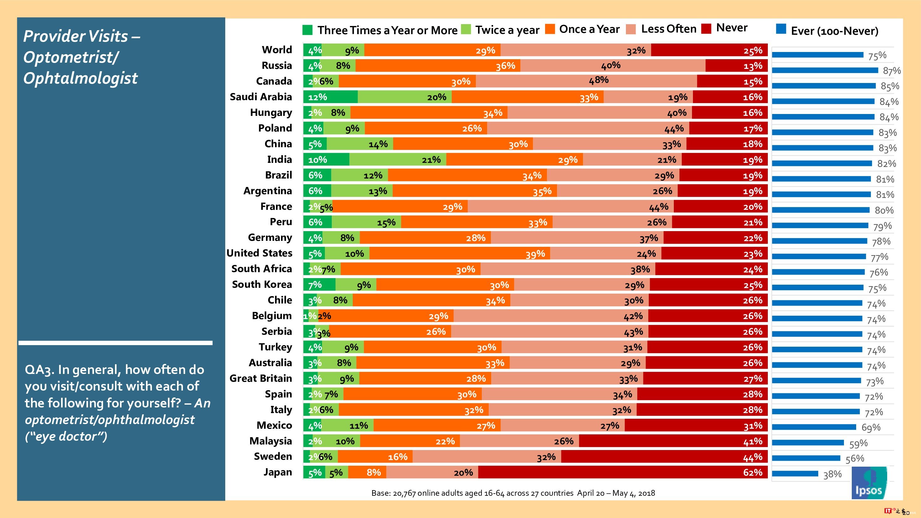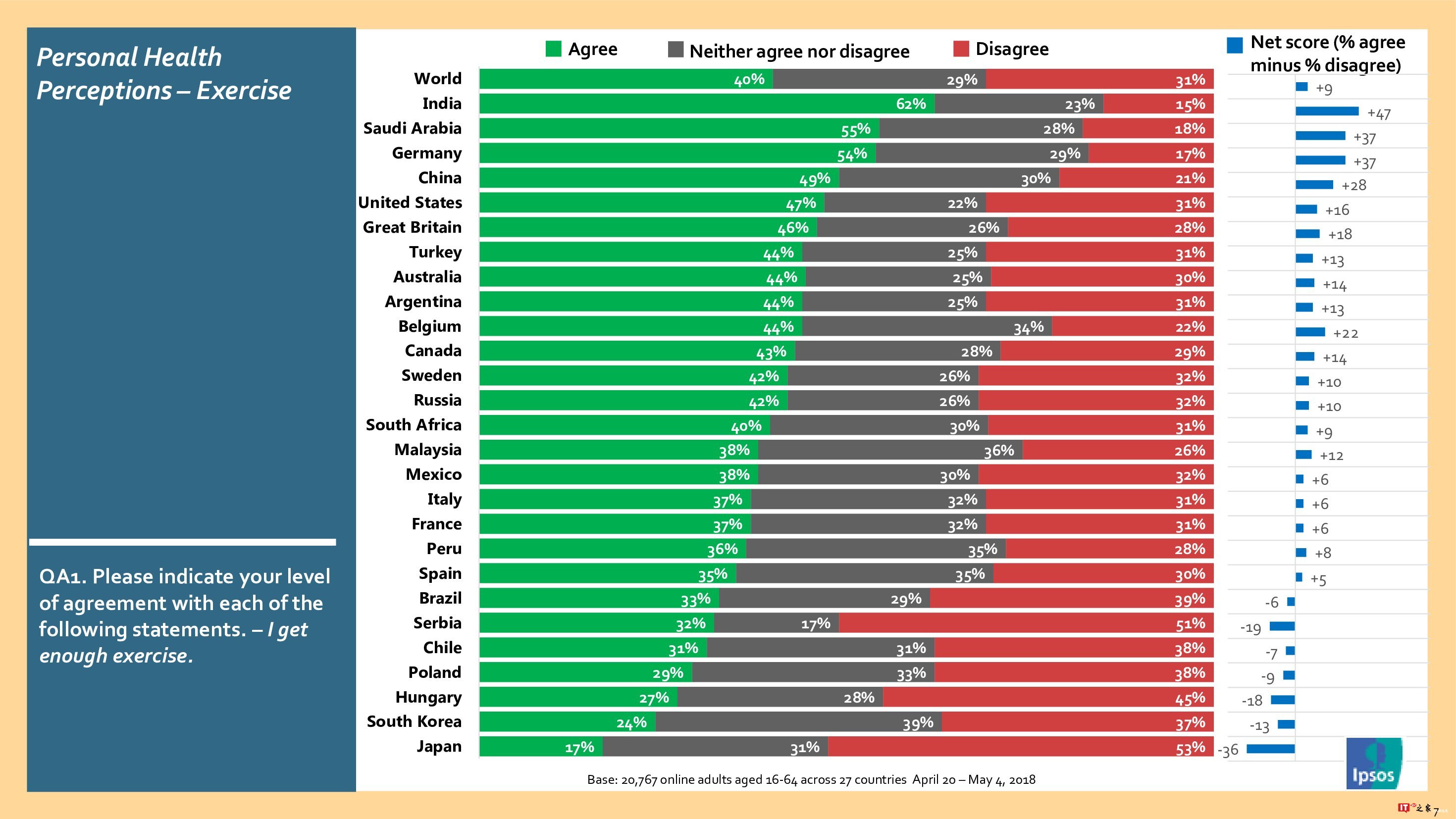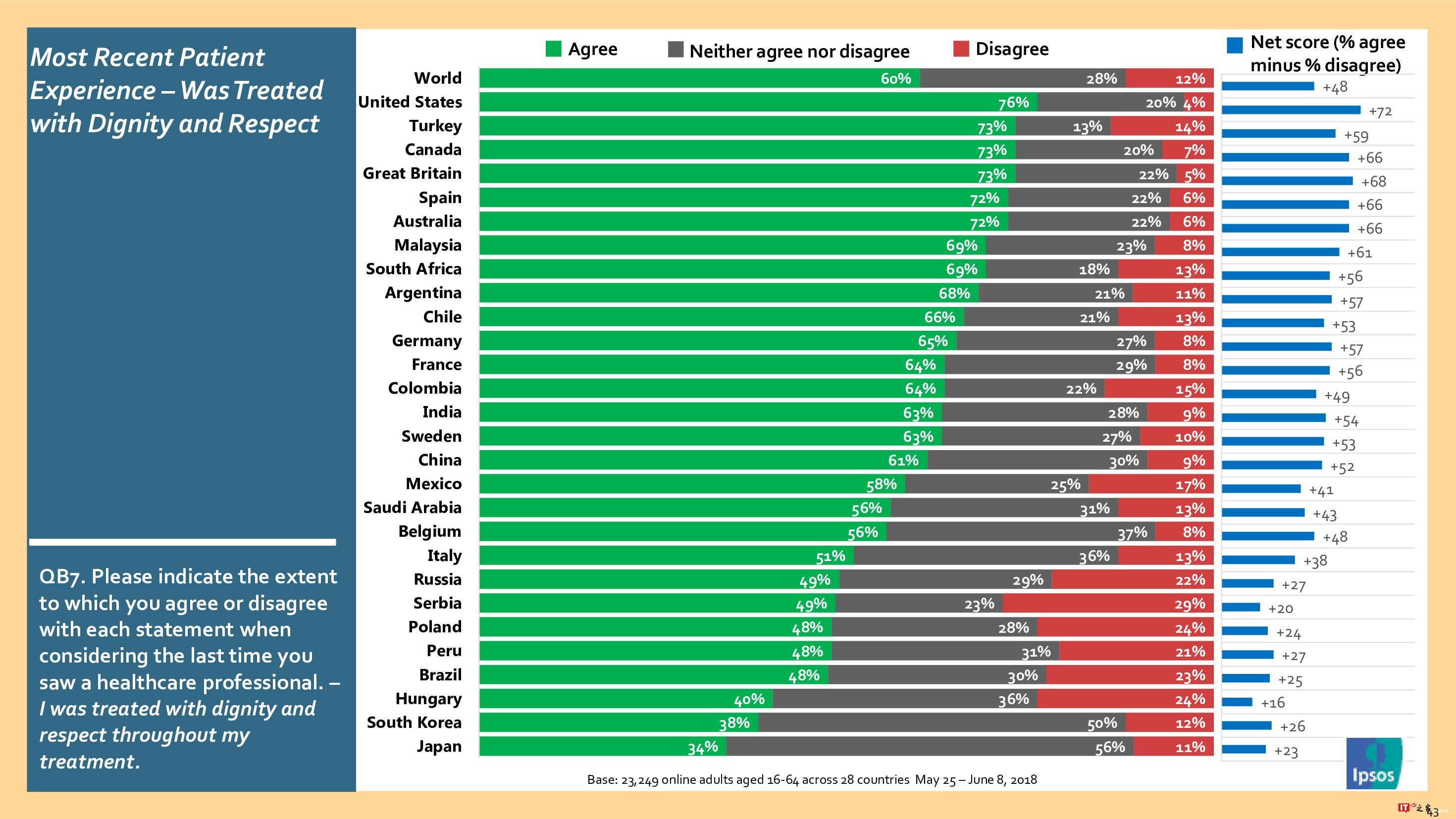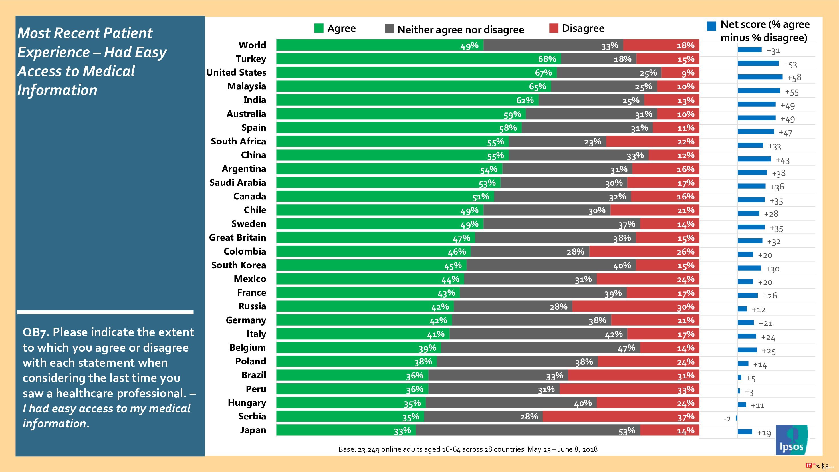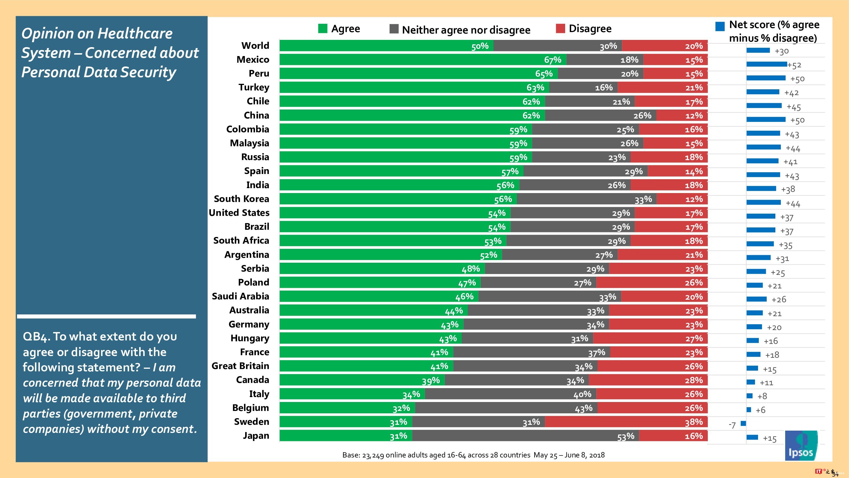 根据益普索对全球23,000多名成年人的调查,消费者对其医疗保健质量的评估差异很大。在全球范围内,45%的受访者认为他们在本国获得的医疗保健质量是好的,33%认为既不好也不差,23%认为很差。在接受调查的国家中,英国(73%)、马来西亚(72%)和澳大利亚(71%)人对本国医疗保健的评价最好。相反,巴西(39%)、波兰(31%)和俄罗斯(29%)的评价最差。