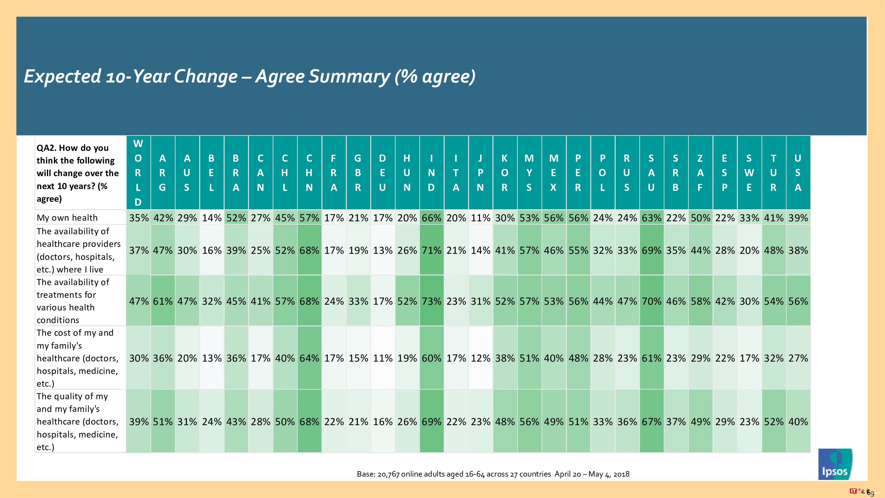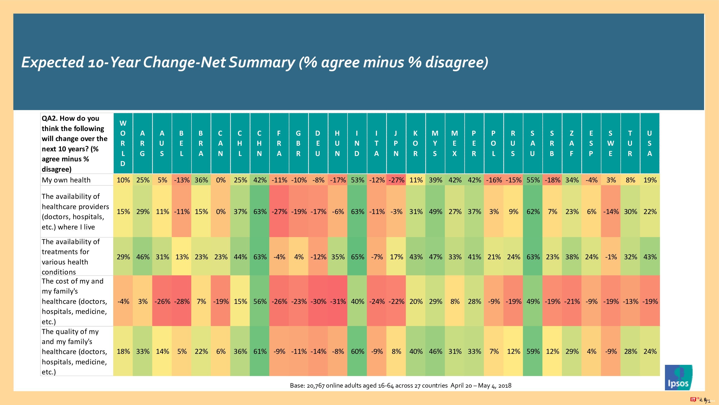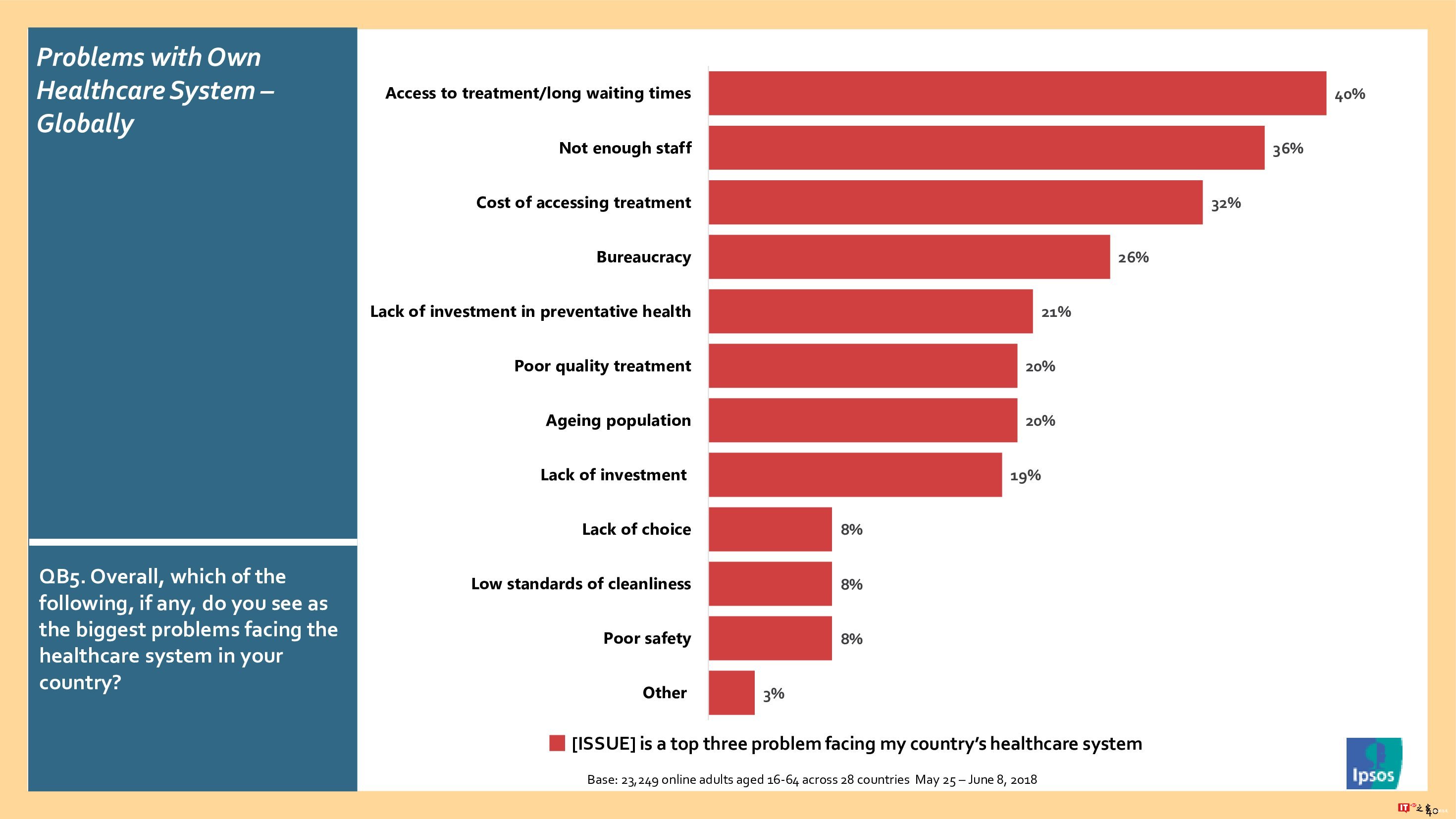 个别国家尤其关注的问题包括:治疗质量差(俄罗斯:59%),人口老龄化(日本:52%,中国:46%),缺乏投资,官僚结构,清洁标准低等。