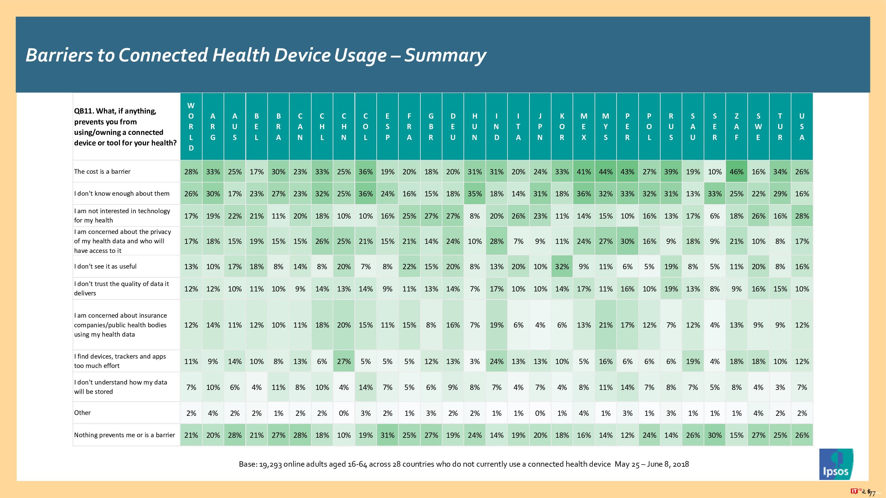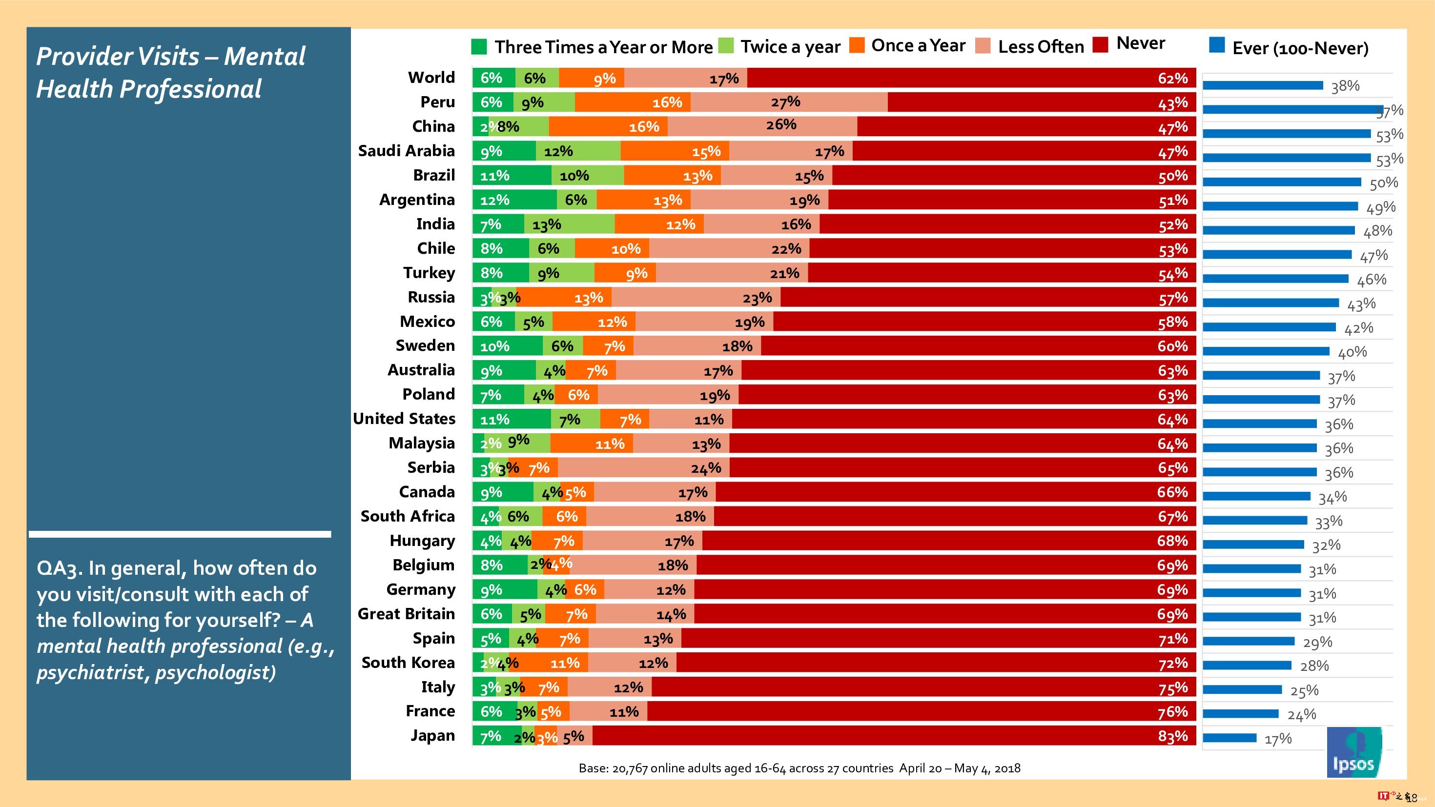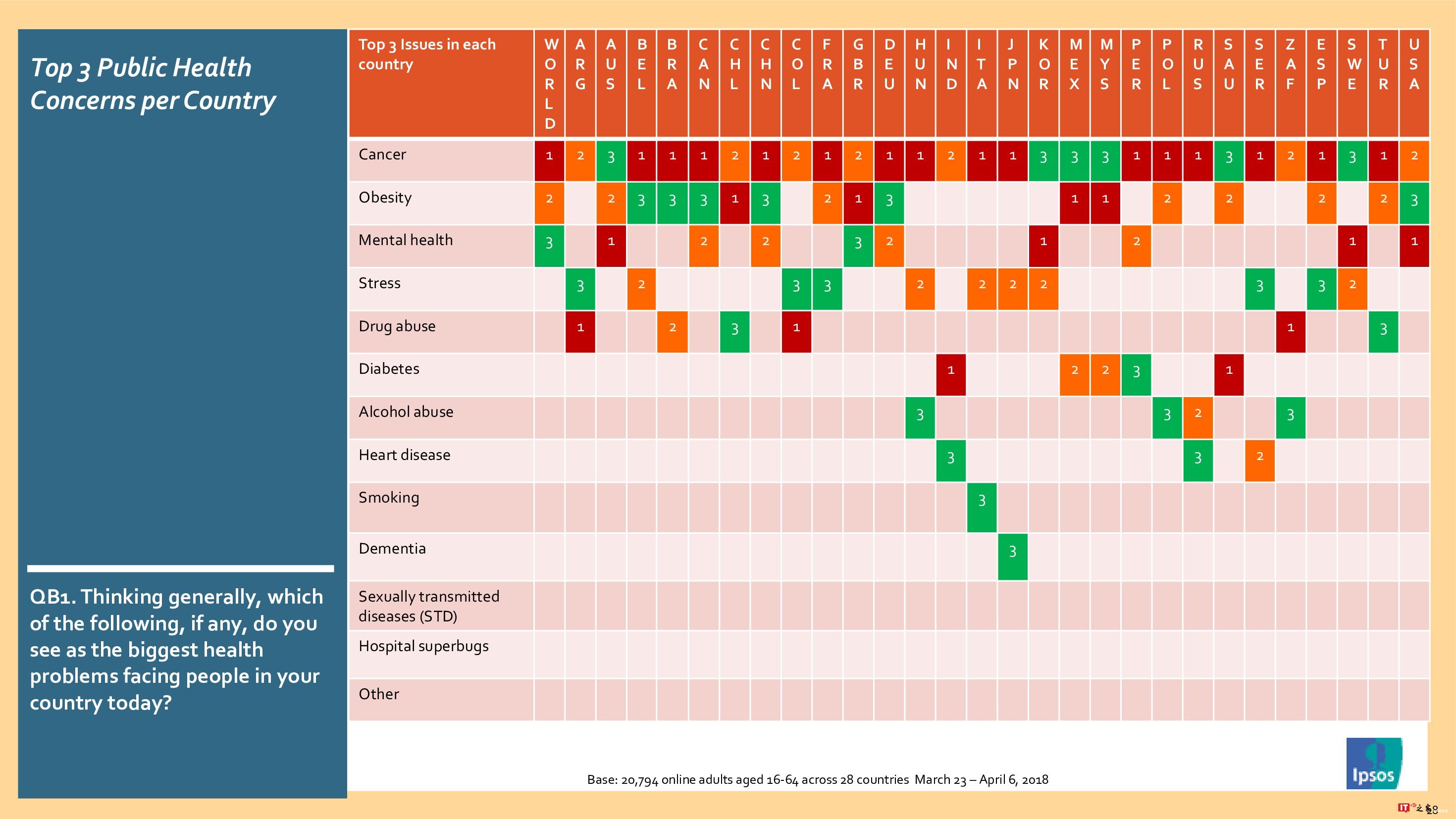 个别国家尤其关注的问题包括:治疗质量差(俄罗斯:59%),人口老龄化(日本:52%,中国:46%),缺乏投资,官僚结构,清洁标准低等。