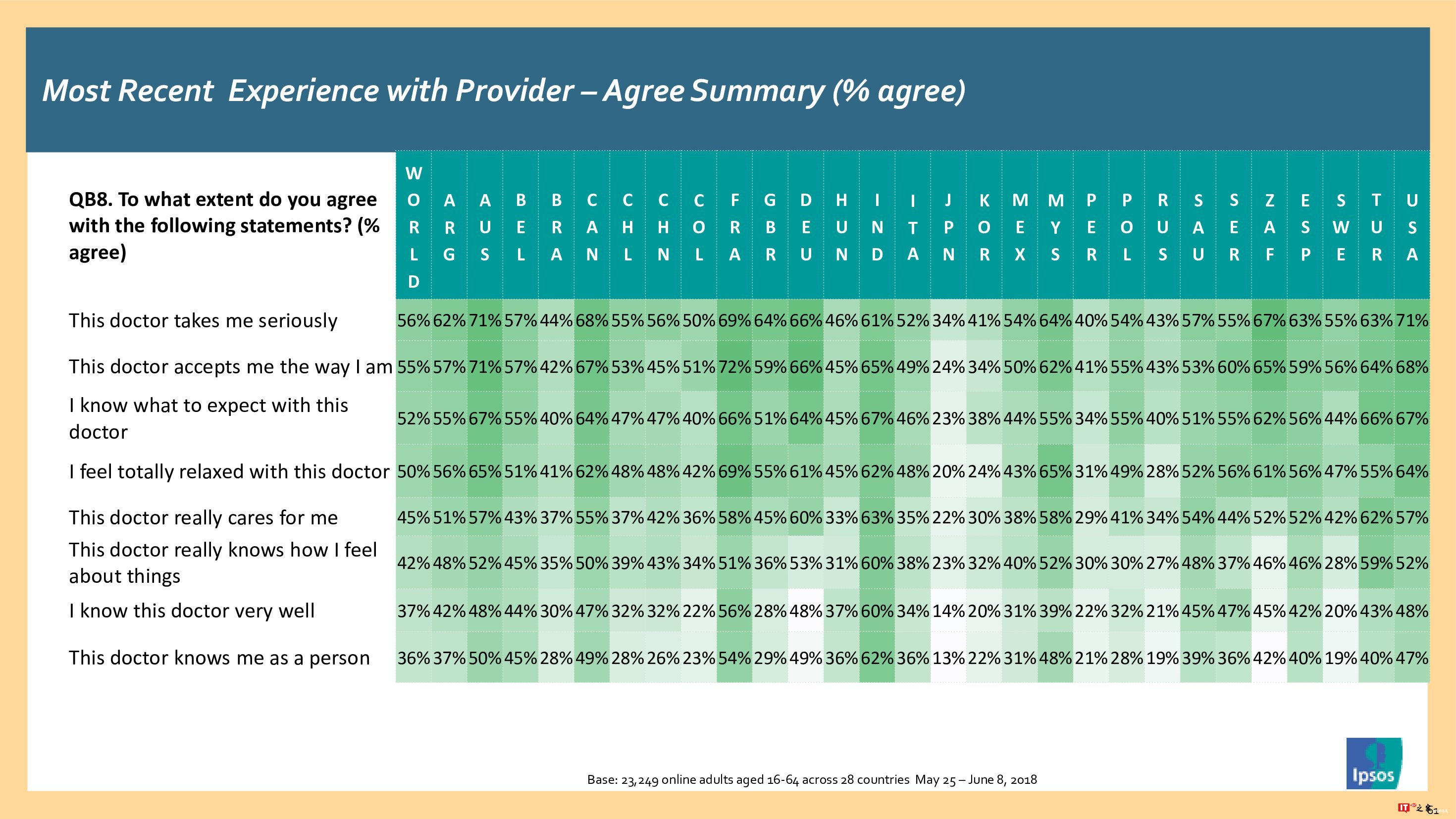 医患关系是全球医疗保健行业的永恒话题,大多数人认为他们最后一次就医时受到尊重(60%),被认真对待(56%),偏好和价值观被尊重(55%)等。但是,“被视为一个人”(36%),非常了解医生(37%),和医生表达情感支持(40%)等指标则比较低。