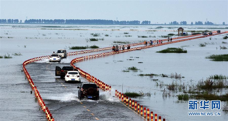 洪水漫过鄱阳湖保护区公路 车在水中行